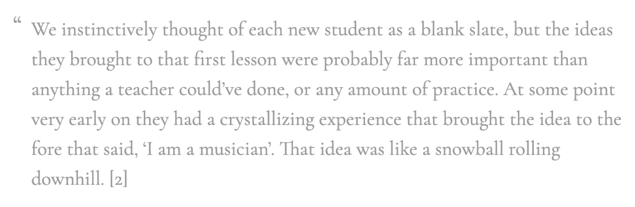 Kids who said their plan is to study “all my life” (the ones who identified as musicians) progressed 400% faster than kids with short-term commitment, even with identical practice time: